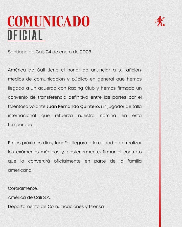 A través de un comunicado, el América de Cali confirmó la llegada del mediocampista Juan Fernando Quintero, procedente de Racing.