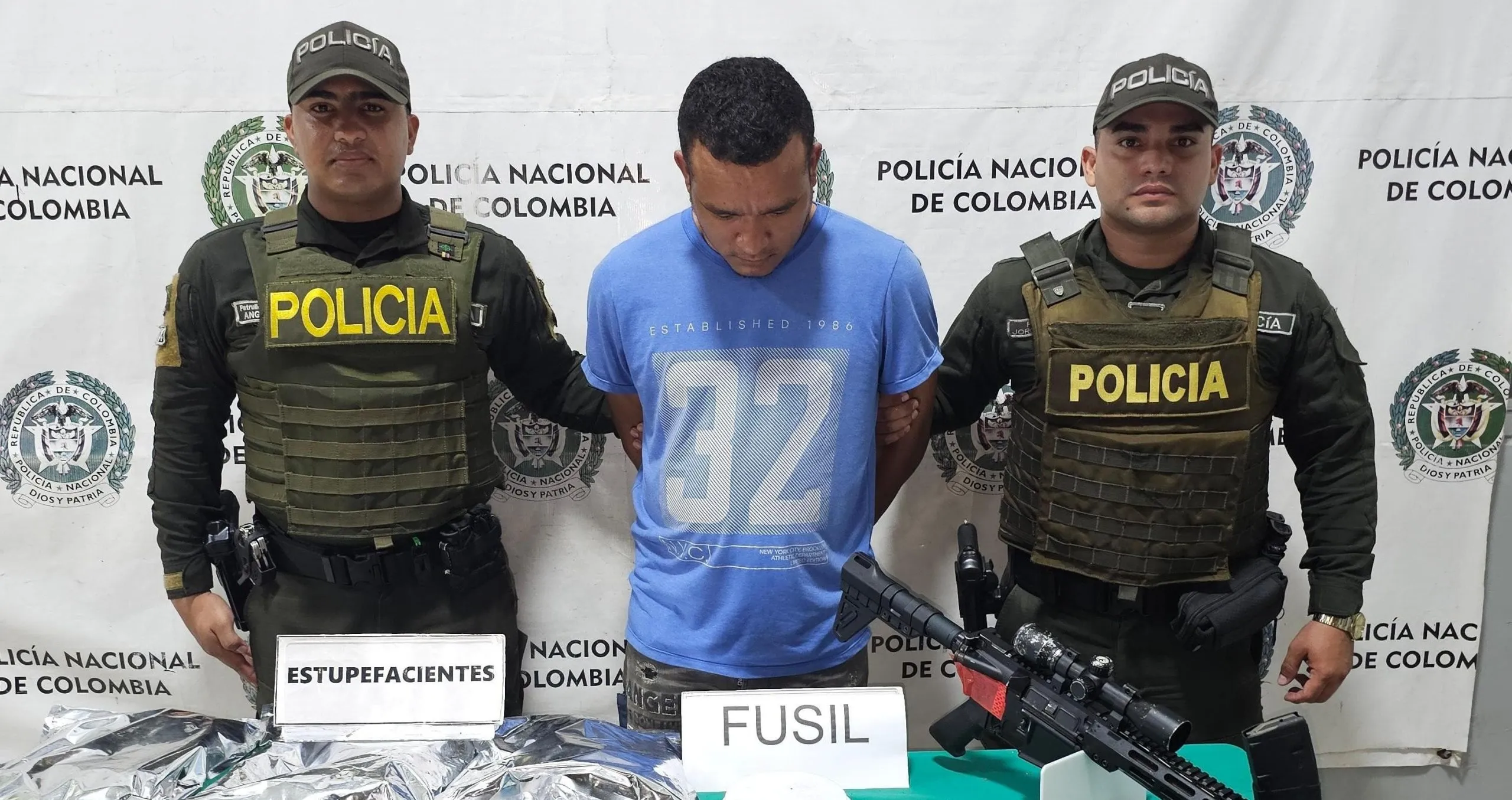 Durante el procedimiento, llevado a cabo en coordinación con la Fiscalía General de la Nación, se logró la incautación de un fusil AR-15 calibre 5.56 milímetros equipado con mira telescópica 4×32, un proveedor, 25 cartuchos calibre 9 milímetros y aproximadamente 3.000 gramos de marihuana.