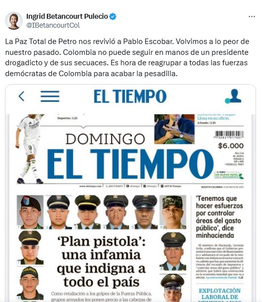 Betancourt denunció en su cuenta de X que la ‘Paz total‘ de Petro “nos revivió a Pablo Escobar”.