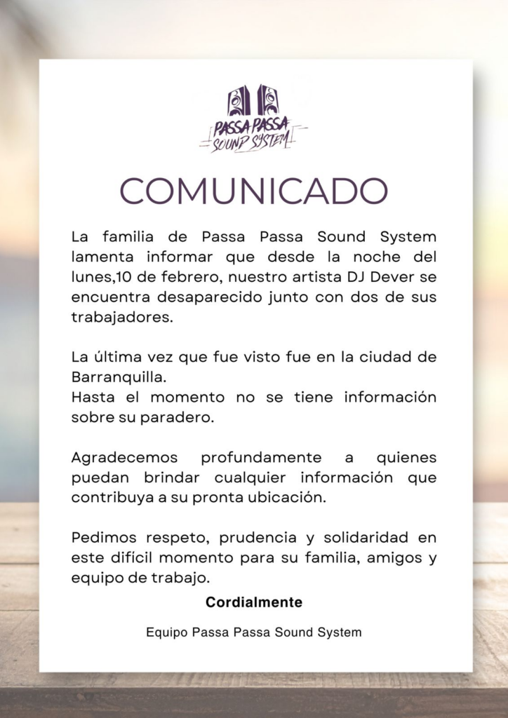 “La familia de Passa Passa Sound System lamenta informar que desde la noche del lunes nuestro artista DJ Dever se encuentra desaparecido junto con dos de sus trabajadores. Hasta el momento no se tiene información sobre su paradero”.