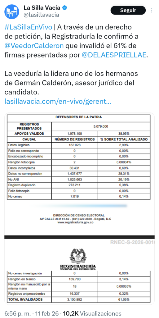 Aunque la Registraduría no divulgó inicialmente la cifra de manera pública, el medio La Silla Vacía aseguró en su cuenta de X que la entidad confirmó, mediante respuesta oficial, la invalidación del 61 % de las firmas entregadas por el precandidato.